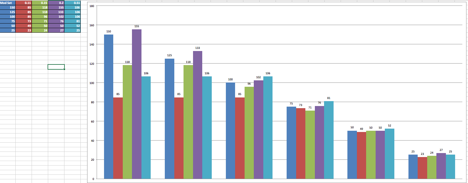 Let'due south get into some data. Resistances for this modern's testing were done at .eleven, .xv, .2 and .51 for the high resistance test. The mod reads resistance accurate and live. The wattage testing points were max watts (150), 125, 100, 75, 50 and 25. At .xi ohms the mod maxed out at 85 watts and 28 amps. The 28 amp limit is insanely low for a dual bombardment mod. 1st time i seen one nether 30 personally. Nigh unmarried can do 30 amps. The remainder of the testing information technology striking low 1-ii watts so pretty dam authentic. At the .15 test information technology maxed out at 118 watts (and again 28 amps) and the rest of the testing hit low from one-4 watts so pretty accurate again.